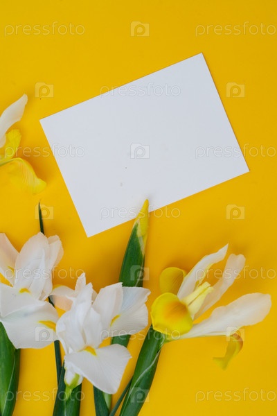 Цветки радуги на ярко-желтом весеннем фоне, праздничный фон 8 марта, копирование пространства на пустой карточке