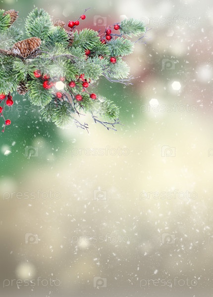 Ветка с красными ягодами и зеленой ветвью вечнозелёного дерева на сером фоне боке со знаменем снежных капель