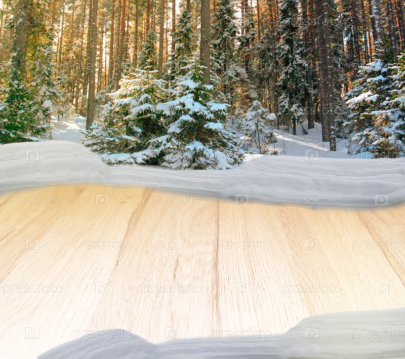 Деревянные доски в зимнем лесу с вечнозеленой древесиной и снегом