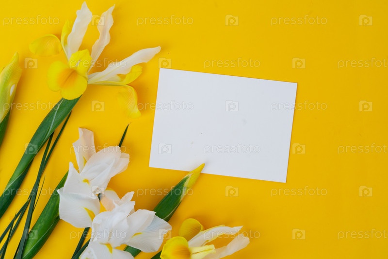 Цветки радуги на ярко-желтом весеннем фоне, праздничный фон 8 марта, копирование пространства на пустой карточке