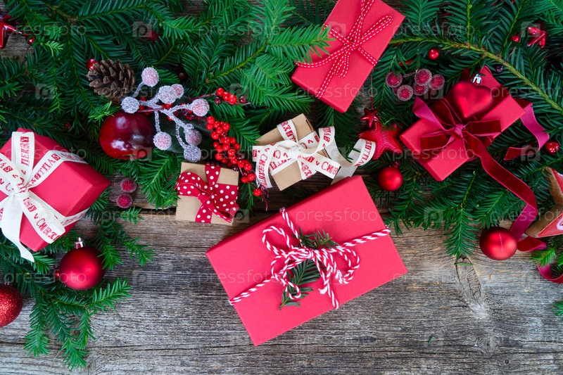 Рождественский подарок - куча упакованных ящиков для рождественских подарков, границы на деревянном фоне, вид сверху