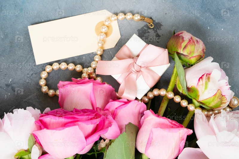 Свежие цветы пионки с коробкой для подарков, вид на близком расстоянии, летний фон