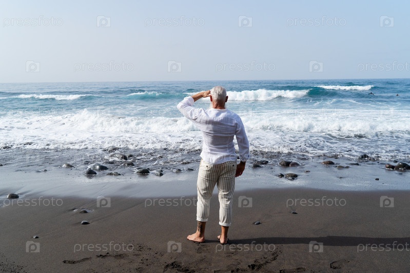 Одинокий пожилой человек смотрит на море, одиночество и концепцию выхода на пенсию