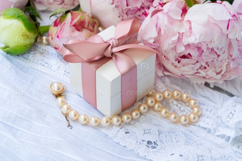 Свежие цветы пионки на кружевном фоне с коробкой для подарков, вблизи зрения, летний фон