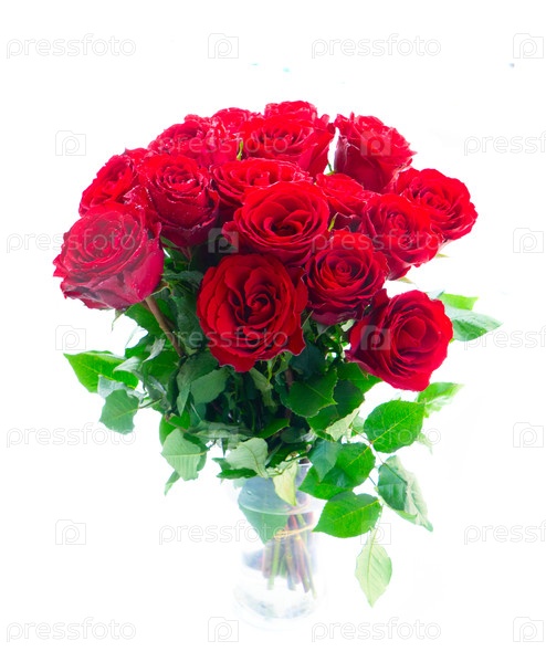 Красные цветы оранжевых роз букет в вазе, изолированный на белом фоне