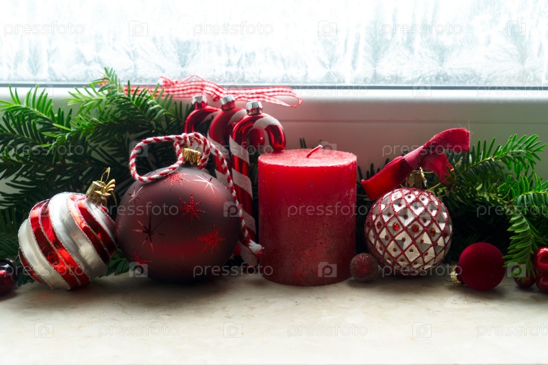 Рождественские красно-зеленые украшения на подоконнике с замороженным окном в фоне