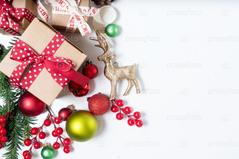 Красочный рождественский образ жизни - вечнозеленые ветви с коробками для рождественских подарков и украшениями