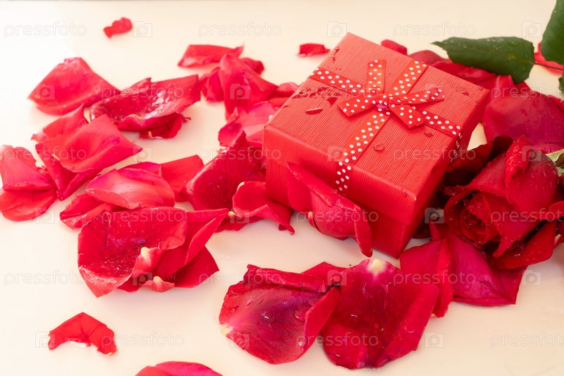 Темно-красные свежие розовые лепестки с коробкой для подарков, лежащей на нейтральном бежевом фоне