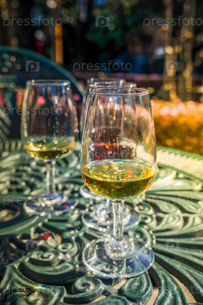 Тестирование портовых вин, бокалы с напитком - белый и красный