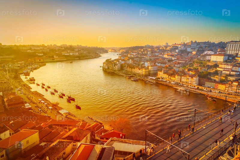 Живописный, красочный вид на старый город Порто при закате солнца в Португалии с мостом Понте Дом Луис через реку Дуро
