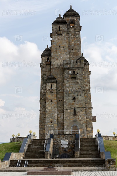 Назран, Ингушетия, Россия - 1 октября 2023 года: Музей памяти жертв сталинских репрессий Девять башен в мемориальном комплексе Мемориал памяти и славы в пасмурный день
