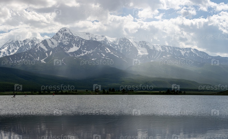Широкоугольная панорама альпийского озера на фоне заснеженных гор Алтая.Туристы ездят верхом по хребту в спокойной воде озера.Летние мероприятия на свежем воздухе