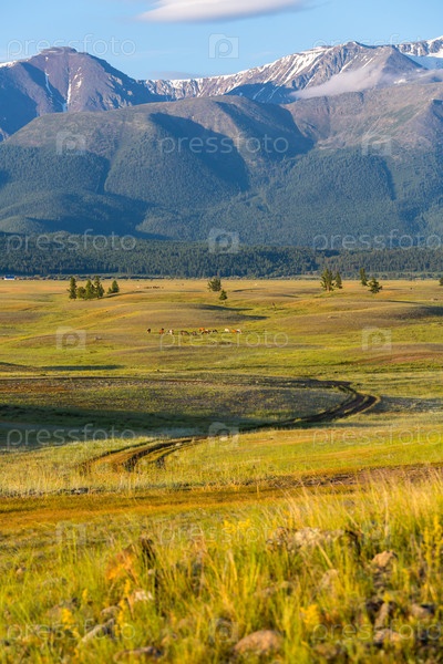 Ландшафт горной долины с бесконечными полями и снежными вершинами на рассвете.Летние каникулы в Алтайском высокогорье
