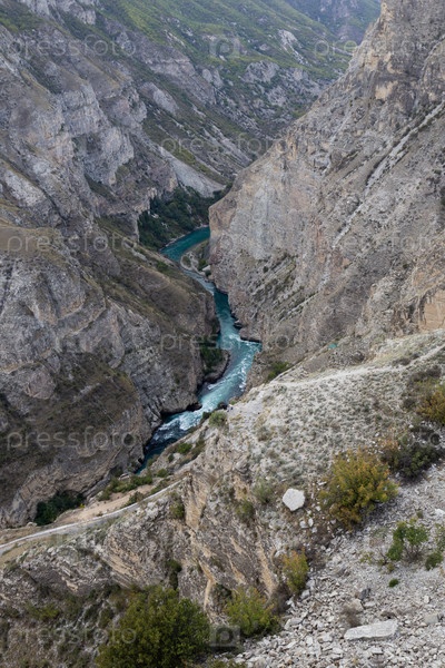 Потрясающий пейзаж с альпийской бирюзовой рекой и горным ущельем со крутыми скалами в горной зоне Республики Дагестан, Северный Кавказ