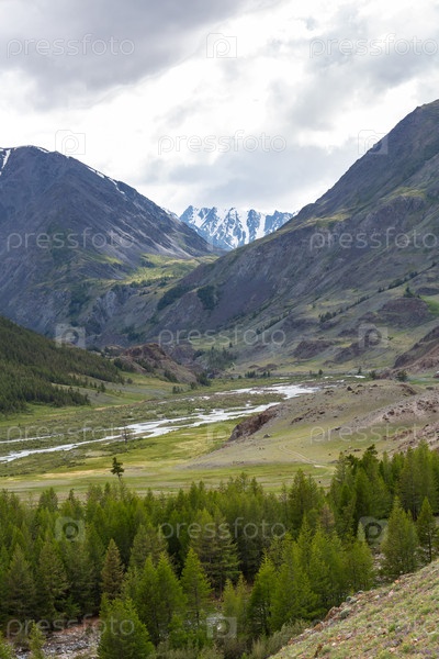 Вид на реку, протекающую через красивую высокогорную долину в скучный летний день.Заснеженные вершины гор Алтая находятся на заднем плане.Путешествие в горы