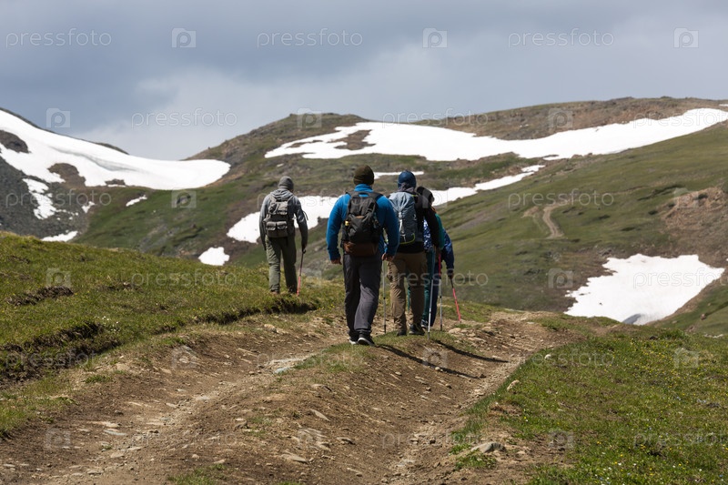 Группа неопределенных пешеходных туристов ходят по тропе на фоне снежно-заснеженных горных склонов.Летние путешествия и приключения в Алтае, Сибирь.Разгляд сзади