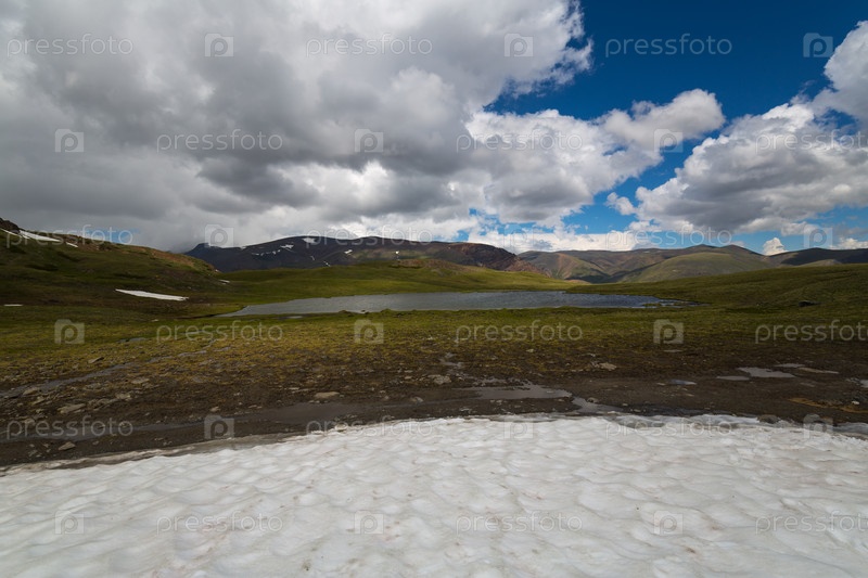 Красивая картина ледникового озера в высокогорной долине в пасмурный летний день на фоне заснеженных гор Алтая, Сибирь