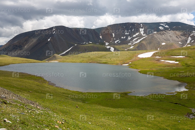 Красивый пейзаж ледникового озера в высокогорной долине в пасмурный летний день на фоне заснеженных гор Алтая, Сибирь
