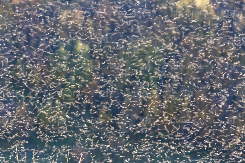 Вид на рой насекомых, поднимающихся в воздухе против лесного фона в солнечный день