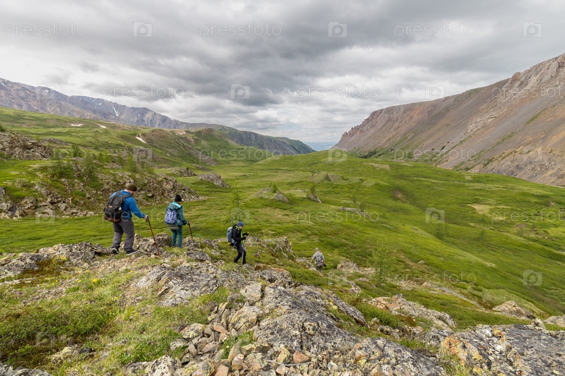 Группа активных туристов спускается в зеленую травянистую долину