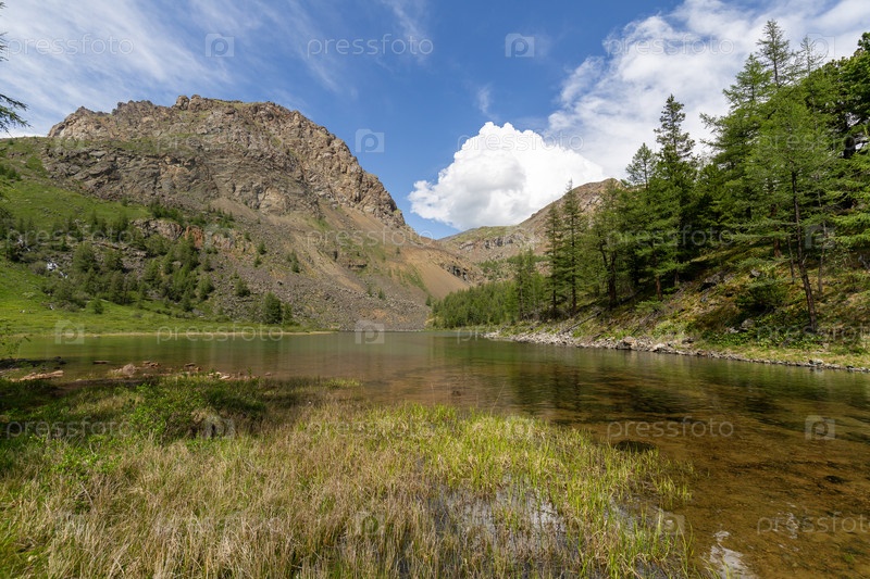 Берег чистого, прозрачного горного озера Куектанар в солнечный летний день на фоне лиственницы и скалистых хребтов Алтайских гор.Путешествие в дикую сибирскую тайгу, походы по природе