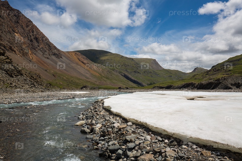 Широкий панорамный вид на речную долину в пасмурный летний день против зеленых склонов и заснеженного Алтайского хребта, Сибирь