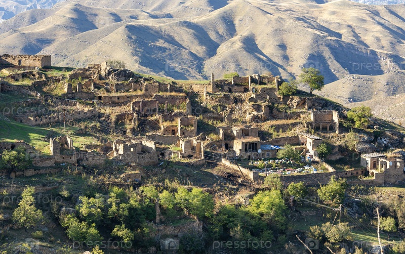Руины заброшенной горной деревни в Дагестане, Республика Северный Кавказ, Россия.Осенний пейзаж в горах.Традиционные каменные дома.Путешествие в высокогорье