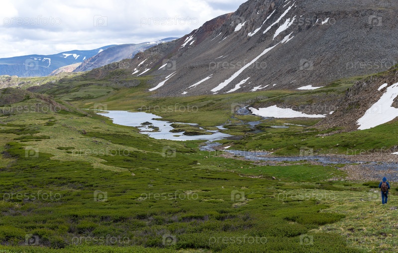 Вид сверху реки, протекающей через травянистую долину среди каменистых склонов.Летние поездки в горы Алтай, красивый пейзаж