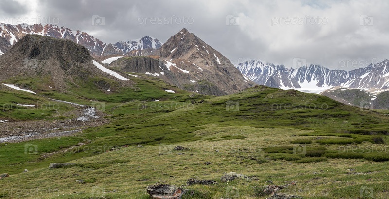 Панорамный вид на речную долину в пасмурный день против скалистых склонов и заснеженного Алтайского хребта, Сибирь.Летние путешествия по высокогорью, открытие дикой природы и исследования