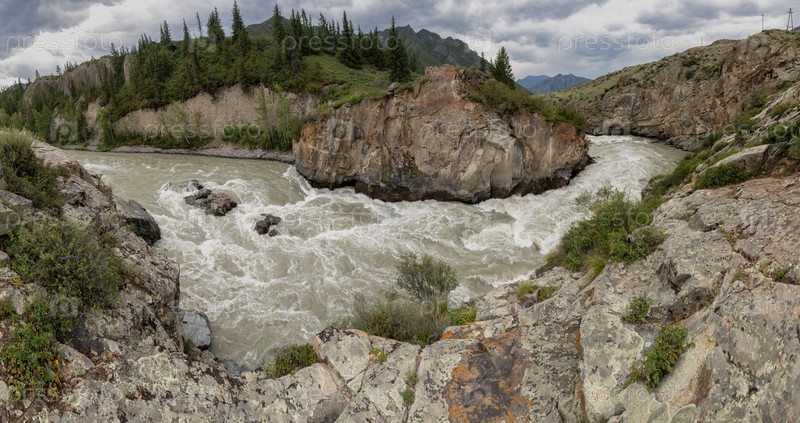 Турбиновые обочины Чуйского река в Алтайском лесу