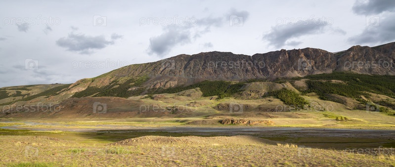 Панорамный вид на реку, протекающую по живописной горной долине в летний вечер.Солнечный свет нежно освещает скалистые склоны сосновым лесом.Путешествия, походы и изучение дикой природы
