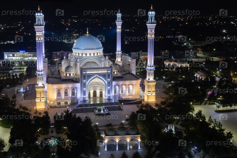 Вид на белую мраморную мечеть 'Гордость мусульман' в городе Шали ночью