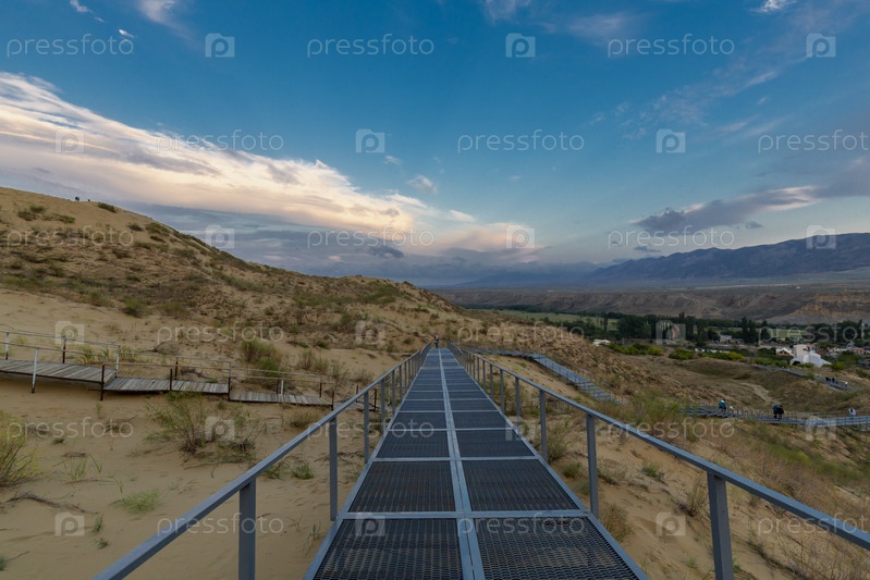 Вид на лестницу, ведущую к вершине Сарыкума - огромной дюны, известной как Дагестанская пустыня. Песчаные склоны покрыты степной травой. Горный хребет Кавказа и закат неба в фоне