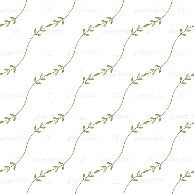 Бесшовный рисунок с тонкими ветвями зеленого растения на изолированном фоне. Диагональный ботанический орнамент с листьями. Минимальный бесшовный фон для обертывания бумаги, обоев, текстиля, посуды