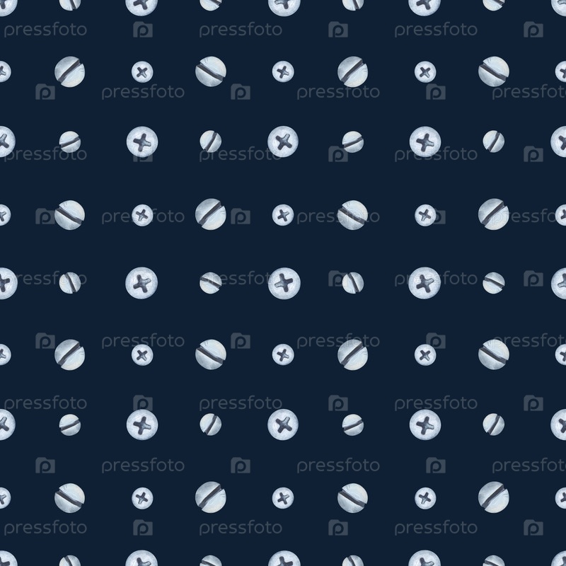Бесшовный рисунок с металлическими головками винтов и болтов на темно-синем фоне. Акварельная иллюстрация рабочих инструментов в натуральных цветах. Реалистичный повторяющийся рисунок для упаковки и отделки строительного бизнеса