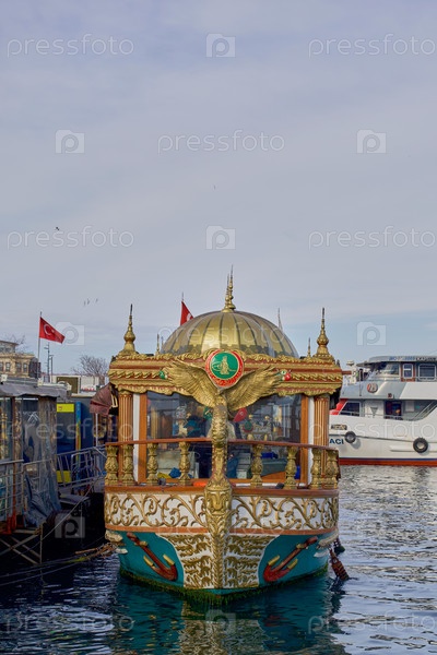 Декоративная лодка с золотым куполом на пирсе в Стамбуле