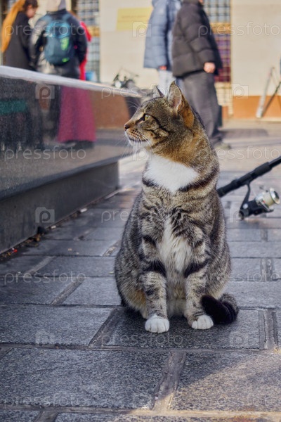 Полосатый кот сидит на городской улице
