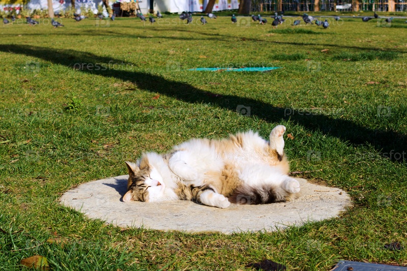 Полосатый кот спит на лужайке