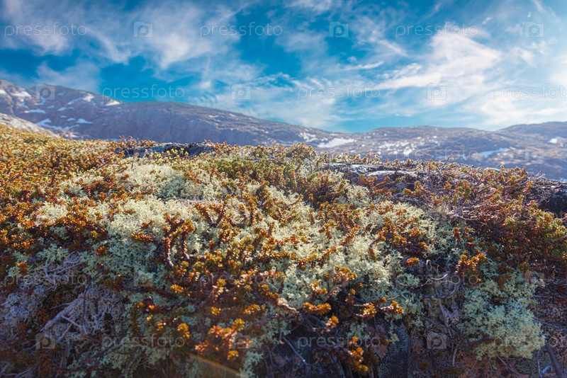 Солнечный пейзаж скалистой горной тундры, покрытой мхом и белыми лишайниками на фоне далеких вершин и ярко-синего неба с облаками