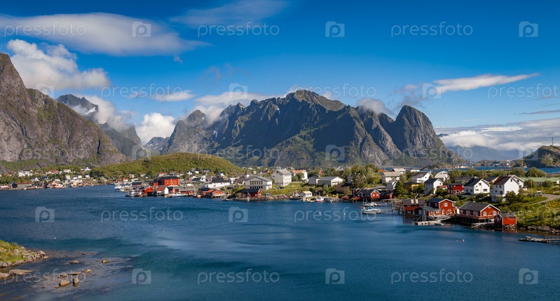 Удивительный пейзаж города Рейнских Островов Лофотен с голубым небом, округ Нордланд, Норвегия