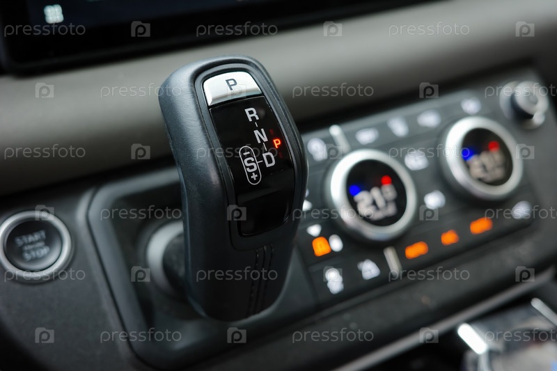 Подробная информация о современном автомобиле автоматическая коробка передач переключатель с позициями передач и приборной панели управления, интерьер автомобиля и концепция технологии вождения