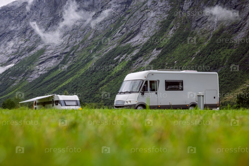 Автомобили, припаркованные на пышно-зеленой лужайке у подножия крутых скалистых гор с низкими облаками, Family Travel Vacation RV, Motorhome Vacation, Caravan Car Vacation