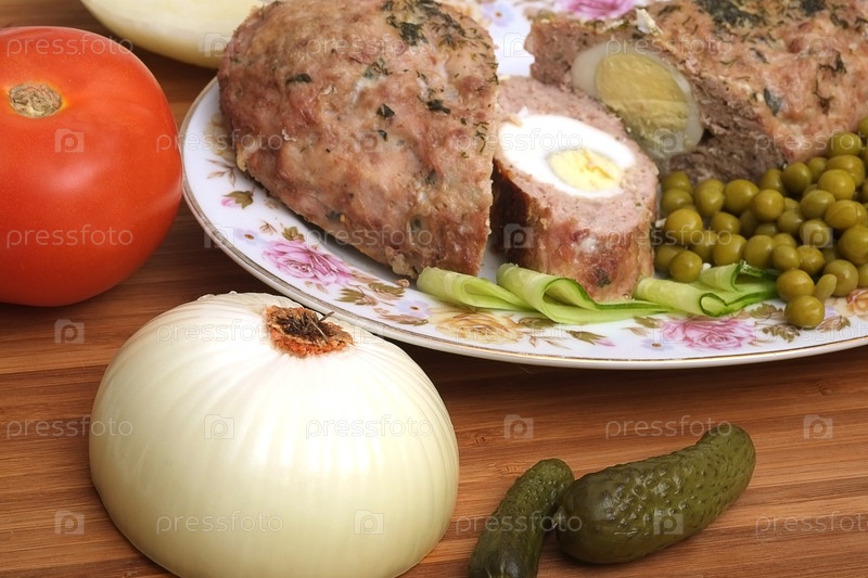 Домашняя мясная булочка, набитая яйцами. Кулинарный фон