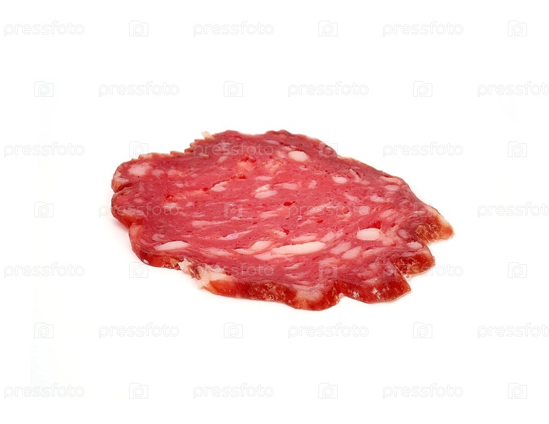 Кусок твёрдо копченого колбасы изолирован на белом фоне