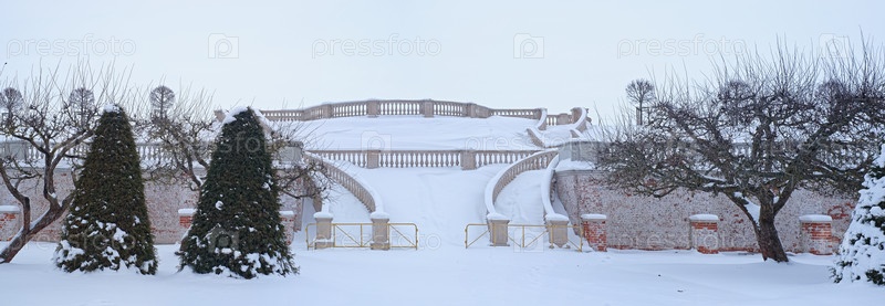 Зимнее утро в Саду Венеры (Марлинский сад) и на Марлинской долине в Петергофе, панорамный вид, Peterhof (Петродворец), Санкт-Петербург, Россия