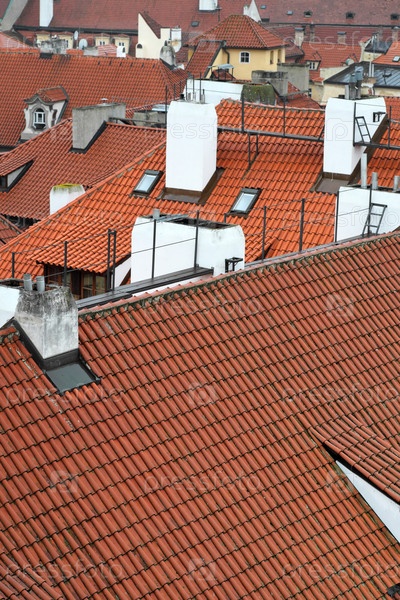 Вид с воздуха на исторические крыши с терракотовыми плитками и белыми дымоходами