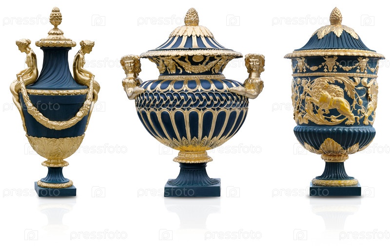 Декоративные зеленые вазы с золотыми античными орнаментами, изолированными на белом фоне