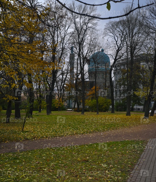 Петербургская соборная мечеть осенью. вид через парк с упавшей лиственницей