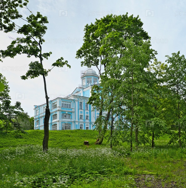 Особняк Воронцова (усадьба Новоznamenка, Санкт-Петербург), голубо-белый барочный дворец Треццини и Ринальди, летний вид с зеленой лугой