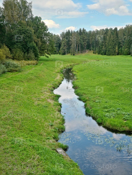 Ландшафт с рекой Славянкой в Государственном музее-заповеднике 'Павловск'.Летний день в Императорском парке
